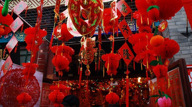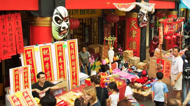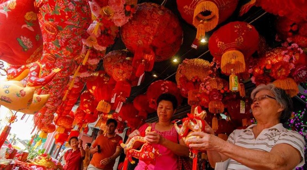 春节的市场上张灯结彩,人山人海,一派繁忙景象。特别是牛车水(唐人街)更是大量出售华人风味食品,中国民族服饰和林林总总的吉祥物。那里锣鼓喧天,舞龙队、舞狮队尽情表演。一年中唯有春节这一天,这里可以燃放烟花炮竹,节日的气氛非常浓郁。“春到河畔迎新年” 是每年春节活动的重头戏,举行的地点是滨海湾。在那里春节期间有各种文艺演出,有各式杂货市场,有中华各地特色小吃,还有迎新灯展,并在新加坡河两岸燃放大型烟花。2012年春节还展出70多手工扎制的巨龙形彩灯,四川成都的灯彩,广西民俗文化表演,还有LED舞龙队,都是新的亮点。一年一度的妆艺大游行,往年都在乌节路等闹市区举行,今年移至新加坡河进行水上大游行,载歌载舞如同扬州古运河花船表演,不知哪个更加出色。