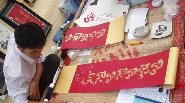 越南人过春节也有贴春联习惯。以前春联用汉字书写,文字拼音化以后,现在大部分春联改用拼音文字,每个拼音字是一个方块,自成风格。另外,越南人也爱在家里贴上“福”、“双喜”等字样和福、禄、寿星的形象,还有各种传统年画,表达对新年的美好祝愿与向往。